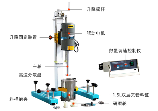 設(shè)備帶有鎖緊及升降手柄,能夠快速升降和固定;分散盤(pán)采用內(nèi)六角螺栓與主軸固定,能夠方便快速拆卸更換,清洗容易;帶有夾桶裝置,可以快速將攪拌桶固定,防止桶在工作中發(fā)生位移造成安全事故。