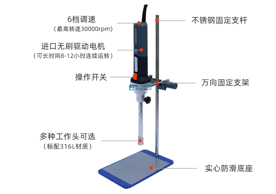 高剪切分散乳化機(jī)集靈巧、方便于一身??墒殖植僮?。選用德國(guó)原裝無(wú)刷大功率馬達(dá),無(wú)刷電機(jī),運(yùn)行更穩(wěn)定,噪聲更小,可處理更大范圍粘度物料。轉(zhuǎn)速可達(dá)30000rpm,可長(zhǎng)時(shí)間8-12小時(shí)連續(xù)運(yùn)轉(zhuǎn),多種工作頭可供選擇,輕松滿足多種高要求分散、乳化、均質(zhì)的實(shí)驗(yàn)要求 。