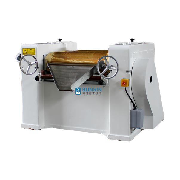 三輥研磨機(jī)由三個(gè)輥筒組成,裝在一個(gè)機(jī)架上,由電動(dòng)機(jī)直接帶動(dòng)。一般輥筒間的轉(zhuǎn)動(dòng)方向不同,前輥向前轉(zhuǎn)動(dòng),中輥向后轉(zhuǎn)動(dòng)。輥?zhàn)愚D(zhuǎn)速前輥快、后輥慢。中間輥固定,前后兩輥裝在滑道上,有彈簧裝置,用手輪調(diào)節(jié)前后輥與中輥的距離。物料由后輥與中輥之間進(jìn)入,受到輥筒的擠壓,產(chǎn)品顆粒變細(xì),然后由快輥帶出,快輥末端裝有刮刀,使物料與輥筒分離,落入收集桶內(nèi)。