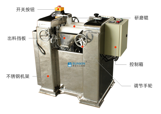 三輥研磨機(jī)由三個輥筒組成,裝在一個機(jī)架上,由電動機(jī)直接帶動。一般輥筒間的轉(zhuǎn)動方向不同,前輥向前轉(zhuǎn)動,中輥向后轉(zhuǎn)動。輥子轉(zhuǎn)速前輥快、后輥慢。中間輥固定,前后兩輥裝在滑道上,有彈簧裝置,用手輪調(diào)節(jié)前后輥與中輥的距離。物料由后輥與中輥之間進(jìn)入,受到輥筒的擠壓,產(chǎn)品顆粒變細(xì),然后由快輥帶出,快輥末端裝有刮刀,使物料與輥筒分離,落入收集桶內(nèi)。