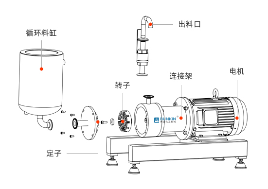 實(shí)驗(yàn)室乳化泵采用臥式結(jié)構(gòu);在狹長的工作腔內(nèi)裝有一組或多組轉(zhuǎn)定子,轉(zhuǎn)定子對(duì)耦精密配合;由電機(jī)帶動(dòng)中間軸進(jìn)行高速運(yùn)轉(zhuǎn),轉(zhuǎn)定子形成真空,物料從雙層料桶進(jìn)口被吸入轉(zhuǎn)定子腔內(nèi),強(qiáng)大動(dòng)能使轉(zhuǎn)子產(chǎn)生極高的線速度,使物料在轉(zhuǎn)、定子間隙之間經(jīng)過強(qiáng)烈的撞擊、破 碎、離心擠、液層摩擦、強(qiáng)力剪切之后泵送出去,物料從出口流出并進(jìn)入單/雙層料桶循環(huán),從而使不相溶的固相、液相、氣相等多種介質(zhì)在瞬間均勻精細(xì)、分散乳化,使產(chǎn)品達(dá)到穩(wěn)定的高品質(zhì)產(chǎn)品。