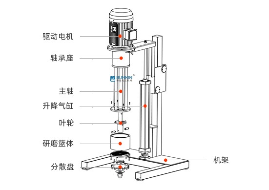 氣動(dòng)升降籃式研磨機(jī)電機(jī)運(yùn)轉(zhuǎn)帶動(dòng)撥桿和底部分散盤高速旋轉(zhuǎn),使分散盤上部及籃腔內(nèi)部形成真空,漿料被吸入籃式研磨腔內(nèi)。撥桿驅(qū)動(dòng)腔內(nèi)的研磨介質(zhì)產(chǎn)生向各個(gè)方向的力,物料中的顆粒受到介質(zhì)不斷地碰撞及摩擦,粒徑變小,粒徑范圍變窄;分散盤的高速運(yùn)轉(zhuǎn),產(chǎn)生渦流將腔內(nèi)物料抽吸出來(lái),再循環(huán)至進(jìn)料,具有非常顯著的分散研磨混合效果, 通過(guò)氣閥旋轉(zhuǎn)或電磁閥點(diǎn)動(dòng)控制實(shí)現(xiàn)氣缸工作,利用氣缸升降帶動(dòng)電機(jī)及工作頭升降。