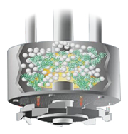 設(shè)備轉(zhuǎn)速可達(dá)3000rpm,強(qiáng)大的動(dòng)能驅(qū)動(dòng)氧化鋯撥桿使腔體內(nèi)的研磨介質(zhì)產(chǎn)生不規(guī)則運(yùn)動(dòng),相互之間高速碰撞、摩擦,使物料粒徑快速變?。谎心ゼ?xì)度好。